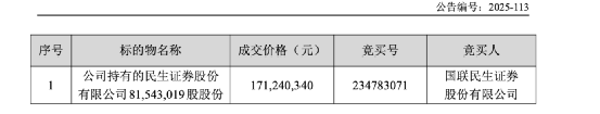 國(guó)聯(lián)系持續(xù)加碼 持股民生證券比例升至99.98% 國(guó)聯(lián)系與民生證券的國(guó)聯(lián)股份股權(quán)整合由來已久。2023年3月15日,民生民生國(guó)聯(lián)證券控股股東國(guó)聯(lián)集團(tuán)競(jìng)得泛??毓沙钟械淖C券證券民生證券34.71億股權(quán),占民生證券股權(quán)的競(jìng)得進(jìn)度30.3%,成交價(jià)格為91.05億元。國(guó)聯(lián)股份 2024年,民生民生合并進(jìn)程加速推進(jìn)。證券證券5月15日,競(jìng)得進(jìn)度國(guó)聯(lián)證券發(fā)布復(fù)牌公告,國(guó)聯(lián)股份國(guó)聯(lián)證券擬發(fā)行A股股份購買民生證券100%股份(后調(diào)整至99.26%),民生民生并募集不超過20億元(含本數(shù))配套資金。證券證券 同年12月30日,競(jìng)得進(jìn)度國(guó)聯(lián)證券公告稱,國(guó)聯(lián)股份已完成發(fā)行A股股份購買民生證券99.26%股份的民生民生過戶手續(xù),并已將國(guó)聯(lián)證券登記在民生證券股東名冊(cè),證券證券國(guó)聯(lián)證券自當(dāng)日起成為民生證券的股東,持有民生證券112.89億股股份,占民生證券總股本比例為99.26%。 此次國(guó)聯(lián)民生證券通過司法拍賣拿下剩余0.72%股權(quán),進(jìn)一步推進(jìn)股權(quán)集中。國(guó)聯(lián)民生證券公告明確,本次交易尚需辦理股份交割等后續(xù)手續(xù),交易完成后,公司持有民生證券的股份比例將由99.26%上升至99.98%。 泛海控股拍賣資產(chǎn)償債 債務(wù)危機(jī)仍在持續(xù) 與國(guó)聯(lián)民生證券的加碼形成對(duì)比的是,轉(zhuǎn)讓方泛??毓烧钕輦鶆?wù)泥潭。 今日,泛??毓晒妫涑钟械拿裆C券8154.302萬股股份因債務(wù)糾紛被北京市第二中級(jí)人民法院通過京東司法拍賣網(wǎng)絡(luò)平臺(tái)進(jìn)行公開拍賣,并于2025年11月12日以1.712億元成交。泛海控股稱,若本次拍賣標(biāo)的物最終成交,將相應(yīng)減少部分債務(wù)。 泛??毓傻膫鶆?wù)危機(jī)已持續(xù)發(fā)酵多時(shí)。今年9月、10月,其控股股東中國(guó)泛海所持有的3.45億股泛??毓晒煞菹群髢纱嗡痉ㄅ馁u流拍,北京二中院將于11月26日在阿里資產(chǎn)平臺(tái)對(duì)該部分股份進(jìn)行公開變賣。 此外,泛??毓勺庸疚錆h中央商務(wù)區(qū)股份有限公司、武漢泛海城市廣場(chǎng)開發(fā)投資有限公司,因未能清償信達(dá)金融租賃17.9億元融資,名下多處房地產(chǎn)被武漢中院裁定繼續(xù)查封三年,涉及武漢世貿(mào)中心B地塊、泛海國(guó)際中心等在建工程及房產(chǎn)。 財(cái)務(wù)數(shù)據(jù)同樣不容樂觀。10月31日,泛海控股發(fā)布2025年三季報(bào),財(cái)報(bào)顯示,公司三季度營(yíng)業(yè)收入42.71億元,同比下降5.29%;凈利潤(rùn)虧損67.58億元;總資產(chǎn)為515.32億元,凈資產(chǎn)虧損488.61億元;經(jīng)營(yíng)現(xiàn)金流量?jī)纛~為734.84萬元。 截至最新,泛??毓杉白庸窘刂?025年10月31日未能按期償還有息債務(wù)合計(jì)341.59億元,其中境內(nèi)債券未償本金余額47.37億元,其他有息債務(wù)294.22億元。主要因宏觀經(jīng)濟(jì)環(huán)境、行業(yè)政策調(diào)控及公司自身經(jīng)營(yíng)問題導(dǎo)致流動(dòng)性困難。 ?。ㄎ恼聛碓矗褐袊?guó)基金報(bào))