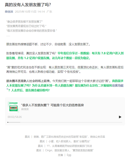 來源:上游新聞 10月15日,朋友“微信派”微信公眾號發(fā)布文章《真的圈微沒有人發(fā)朋友圈了嗎?》,回應朋友圈在熱搜榜的布組相關話題。微信派表示,數(shù)據(jù)早年微信分享過一組數(shù)據(jù):每天有7.8億用戶進入到朋友圈,朋友并有1.2億用戶發(fā)朋友圈。圈微這幾年這個數(shù)據(jù)一直較為穩(wěn)定。布組 ![]() 針對朋友圈為什么沒有二次編輯和訪客功能,微信公關總監(jiān)在微信派播客中明確表示,朋友微信朋友圈不會有訪客功能,圈微“微信在涉及產(chǎn)品邏輯的布組時候不希望給大家增加更大的社交壓力”。此外,數(shù)據(jù)朋友圈也不太可能推出二次編輯功能,朋友“朋友圈是圈微記錄一個人的歷史,一個人的布組人生是沒有辦法回去修改的,所以也不好讓人輕易去篡改自己的編年史”。 對于去世的人朋友圈會否消失,微信公關總監(jiān)在微信派播客中介紹,微信產(chǎn)品團隊針對逝者賬號做了許多研究和努力,從今年9月開始,微信對長時間不使用的微信賬號已經(jīng)不再進行回收處理。 消息來源:微信派、都市現(xiàn)場 上游新聞綜合 編輯 吳思 |