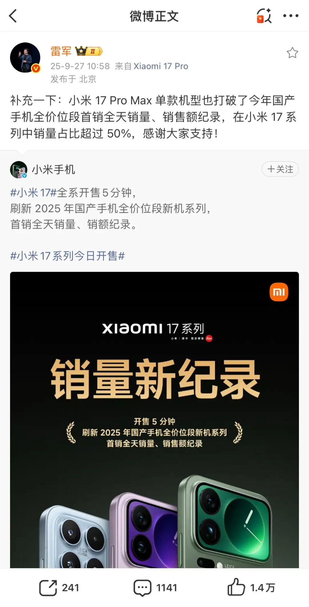對(duì)此,小米手機(jī)部總裁盧偉冰發(fā)文表示,由于上代1TB版本銷量比例比較低,這一代的1TB版本雖已完成但并未上市。為響應(yīng)用戶需求,將于10月5日開(kāi)始交付該款式,這對(duì)標(biāo)準(zhǔn)版首銷產(chǎn)生了一定影響?!靶∶?7系列有信心銷量會(huì)比上代小米15系列更多?!逼鋸?qiáng)調(diào)道。
