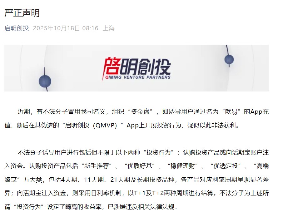 截至最新,啟明創(chuàng)投已連發(fā)3次嚴(yán)正聲明,強調(diào)私募基金僅向特定符合條件的合格投資人募集資金,啟明創(chuàng)投無官方App。