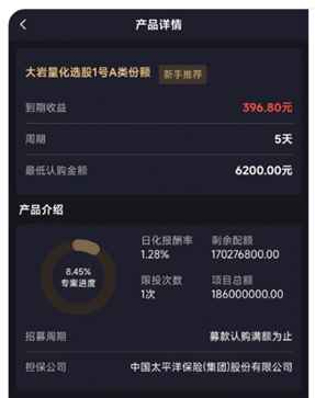 比如,一款名為“大巖量化選股1號A類份額”的產(chǎn)品,最低認(rèn)購金額為6200元,日化報酬率為1.28%,投資周期為5天,到期收益為396.80元,該產(chǎn)品的擔(dān)保機構(gòu)為中國太平洋保險。