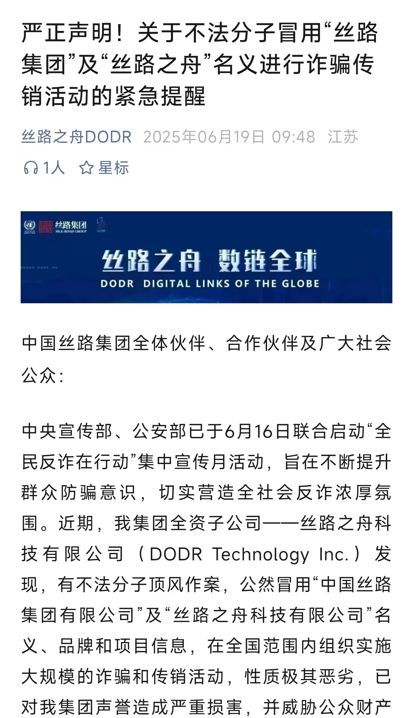 今年5月-6月期間,絲路之舟科技有限公司在微信公眾號密集發(fā)布了十余條嚴(yán)正聲明,稱近日發(fā)現(xiàn)有不法分子冒用公司名義于2024年10月1日上線名為“DODR”的非法App,并在全國建立或授權(quán)建立“DODR絲路之舟信息咨詢處”,通過非法獲取的公司介紹和視頻等信息,在平臺發(fā)布虛假的國際工程項目,誘導(dǎo)公眾投資并承諾高額回報和所謂股權(quán)激勵。這些虛假宣傳和集資行為已經(jīng)構(gòu)成犯罪。