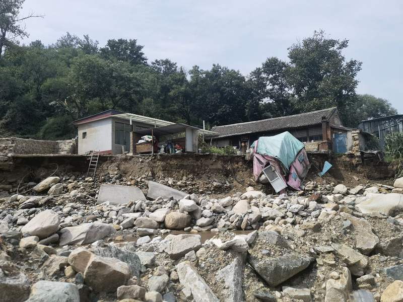 8月15日,尹春燕當(dāng)初想要去幫助轉(zhuǎn)移的老人家,門前的道路被水沖垮。新京報(bào)記者 周懷宗 攝
