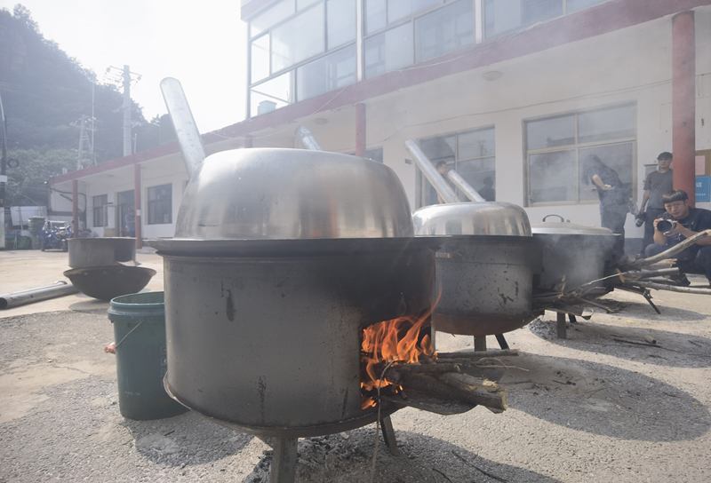 8月15日,孫胡溝村村委會(huì)院子里,大鍋為安置點(diǎn)的村民和村里的老人做飯。新京報(bào)記者 周懷宗 攝