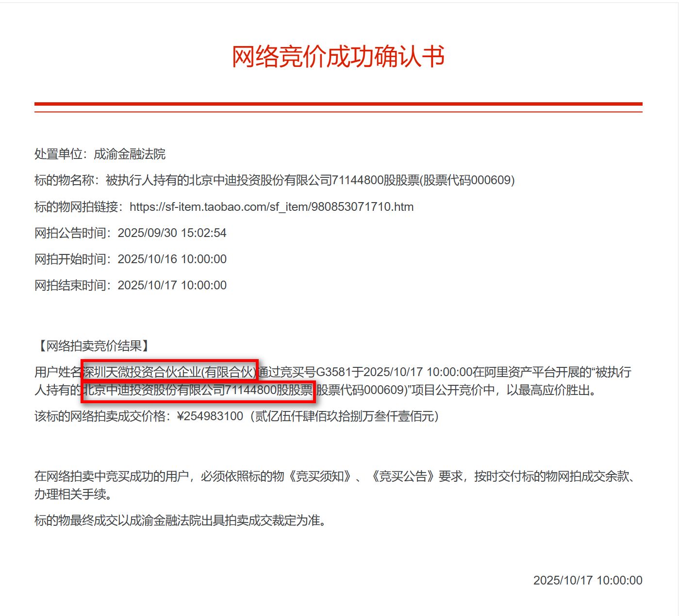 “各方都很意外。權(quán)遭”10月25日上午,襲成新公芯生在與每經(jīng)記者溝通時,立僅一位不愿具名的個月ST中迪高管回憶,拍賣在截止前幾分鐘(約9:54)才突然有天微投資出價,產(chǎn)舊成交價2.55億元也超出了上市公司及銀行的三盲預(yù)期——“原以為會流拍”。