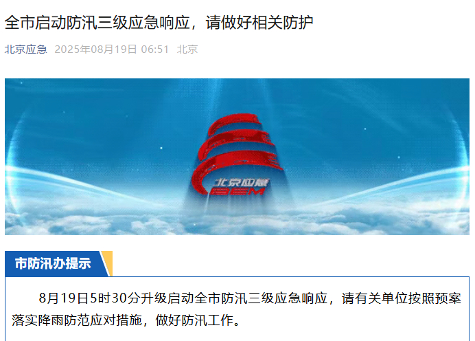 新京報(bào)訊 據(jù)北京應(yīng)急微信公眾號(hào)消息,北京北京市防汛辦提示:8月19日5時(shí)30分升級(jí)啟動(dòng)全市防汛三級(jí)應(yīng)急響應(yīng),全市啟動(dòng)請(qǐng)有關(guān)單位按照預(yù)案落實(shí)降雨防范應(yīng)對(duì)措施,防汛防護(hù)做好防汛工作。應(yīng)急響