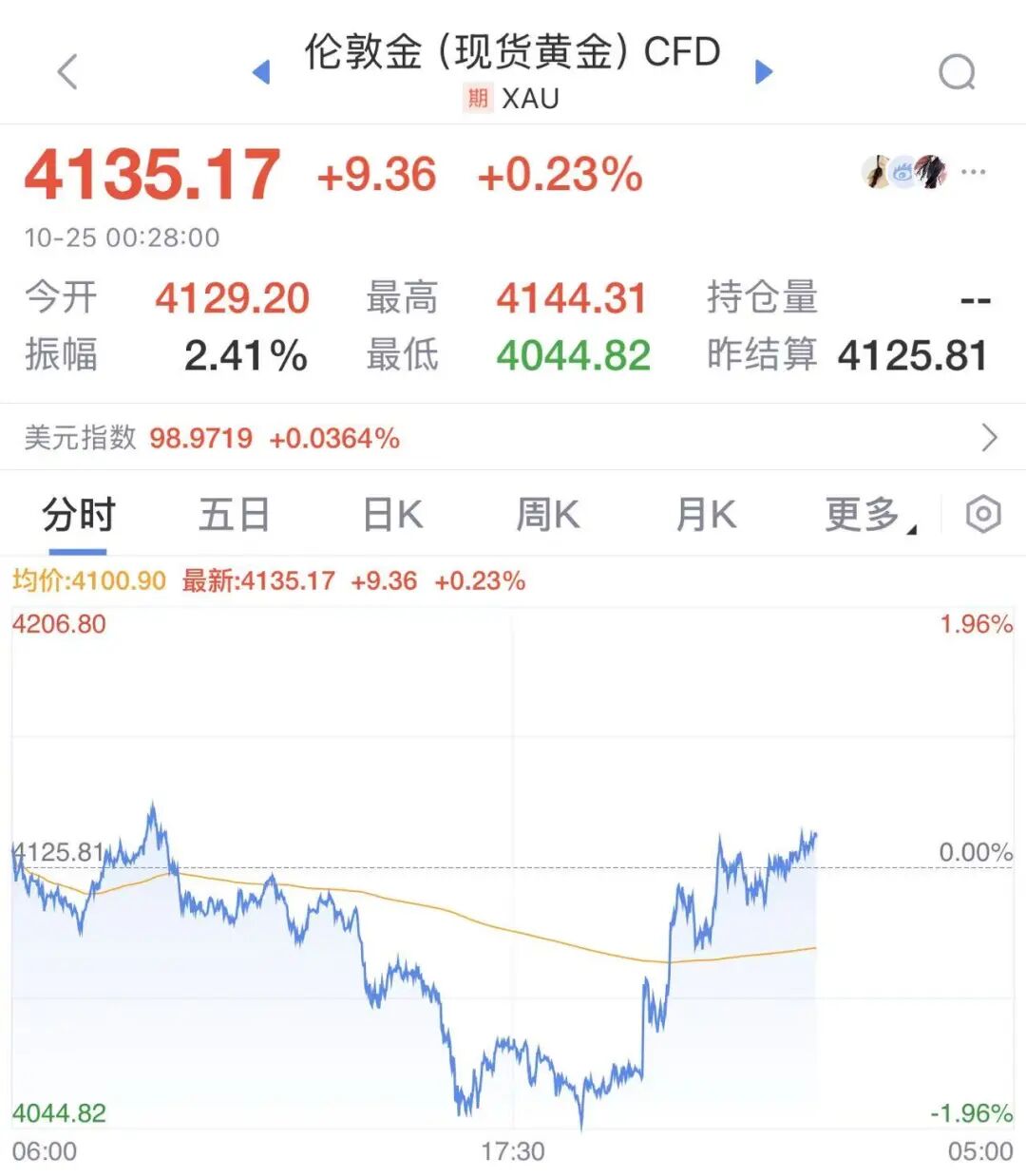 國際金價V字反轉,現(xiàn)貨黃金重新站上4100美元,日內由跌轉漲。