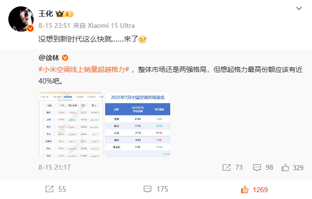 彼時起因是數據平臺奧維云網發(fā)布了7月空調線上銷量排行榜數據,小米空調線上市占率首次超越格力,以16.71%位居全平臺第二(第一為美的18.61%),相關內容獲小米集團總裁盧偉冰、公關部王化等人轉發(fā)并評論。
