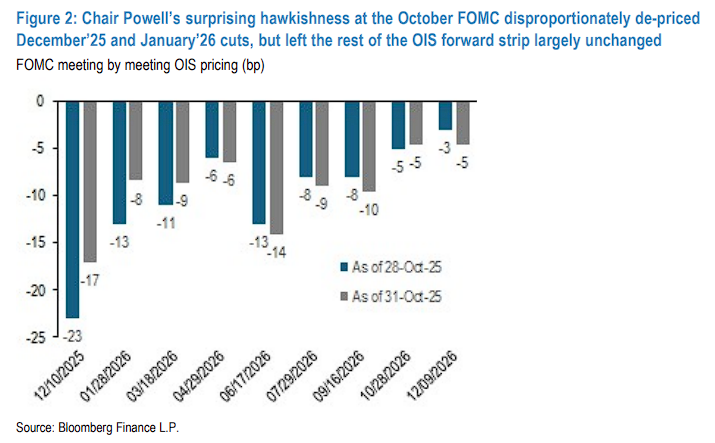 (鮑威爾主席在10月FOMC會議上出人意料的鷹派立場,導(dǎo)致市場大幅下調(diào)了對2025年12月和2026年1月降息的預(yù)期定價(jià),但對OIS遠(yuǎn)期曲線的其余部分基本沒有影響)