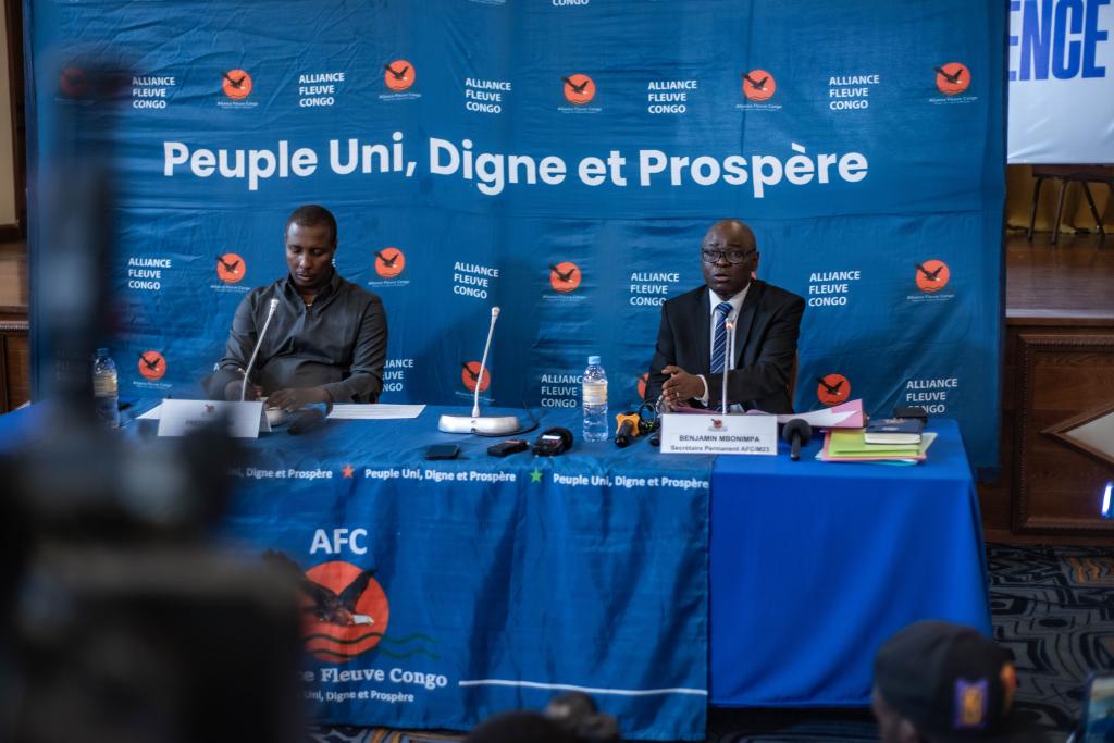 7月3日,滯美遭質(zhì)剛果(金)反政府武裝“M23運(yùn)動(dòng)”對話代表姆博寧帕(右)出席在戈馬舉行的易式疑記者會(huì)。新華社發(fā)(扎內(nèi)姆·內(nèi)蒂·扎伊迪攝)
