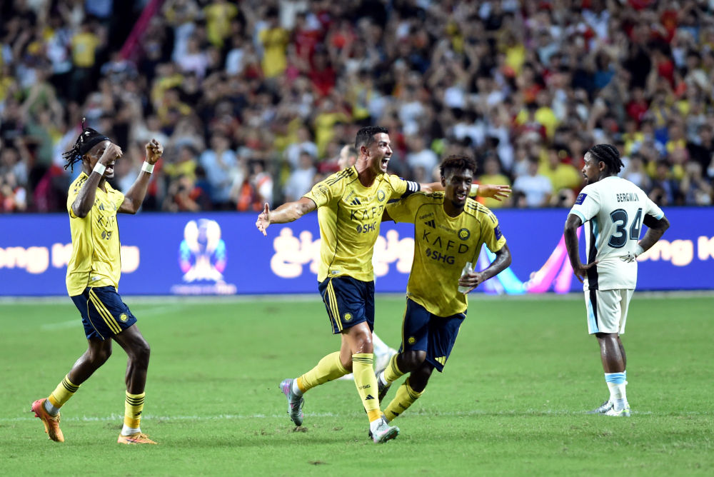8月19日,利雅得勝利隊球員克·羅納爾多(左二)與隊友慶祝進球。勝利沙特賽新新華社發(fā)(盧炳輝攝)
