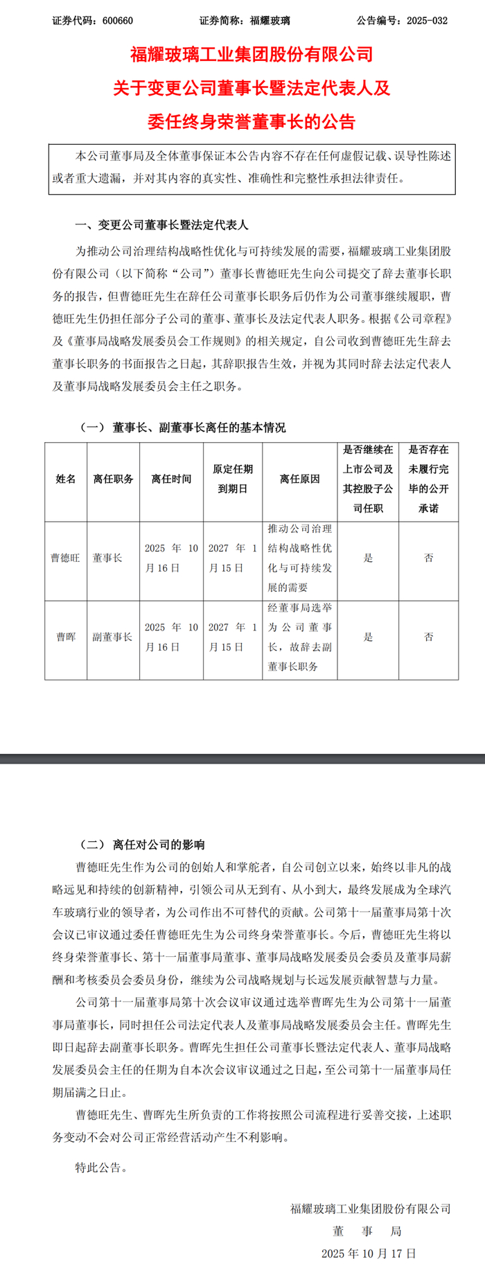 福耀玻璃(600660.SH)公告稱,曹德公司董事長曹德旺因推動公司治理結(jié)構(gòu)戰(zhàn)略性優(yōu)化與可持續(xù)發(fā)展的旺辭需要,辭去董事長職務(wù),去福其曹但將繼續(xù)擔(dān)任公司董事及部分子公司的耀玻董事、董事長和法定代表人職務(wù)。璃董