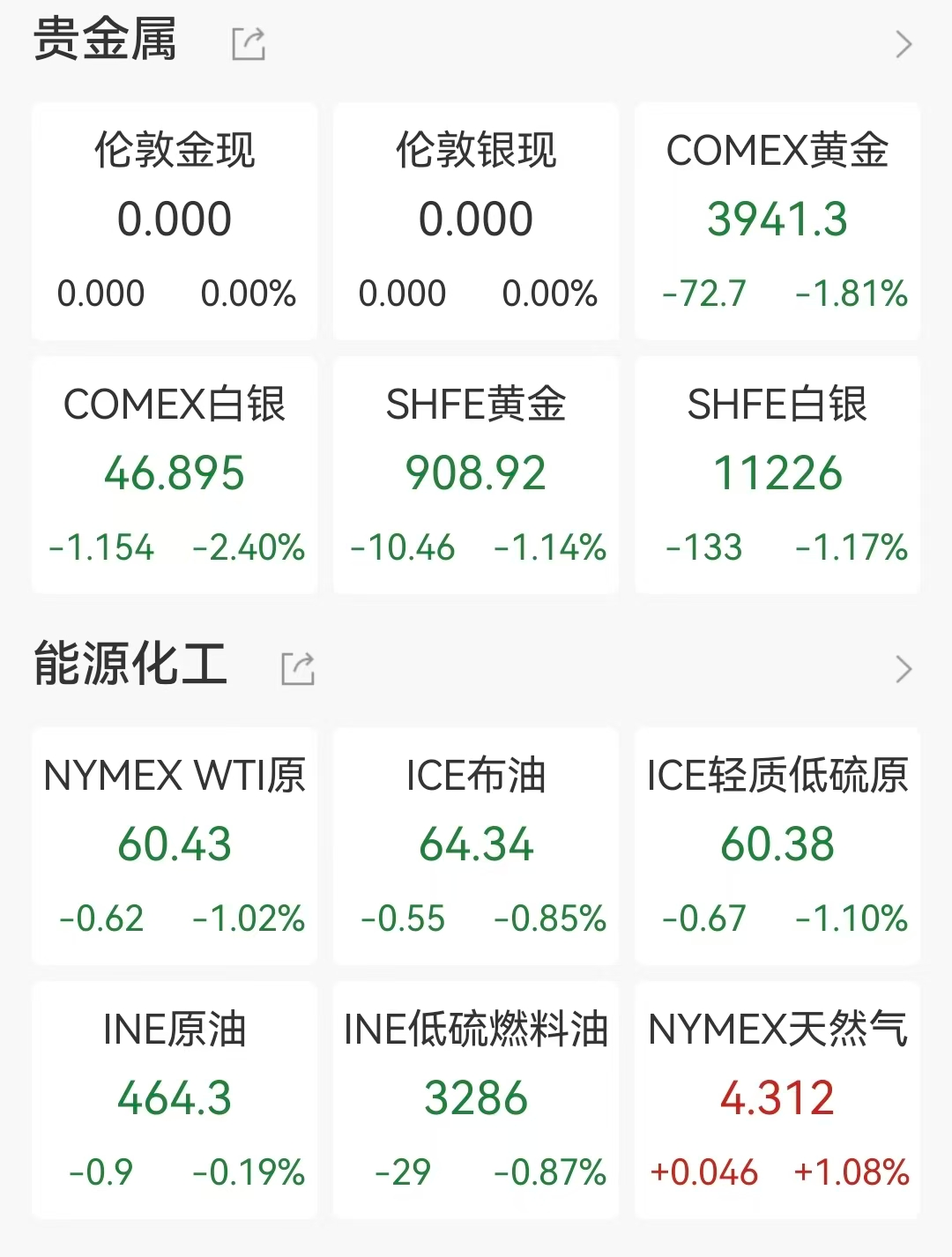 國際貴金屬期貨普遍收跌,COMEX黃金期貨跌1.81%報(bào)3941.30美元/盎司,COMEX白銀期貨跌2.40%報(bào)46.90美元/盎司。