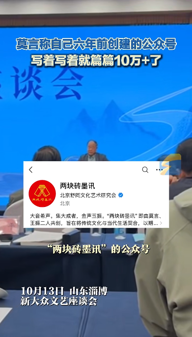 會(huì)上,文章談到自己的點(diǎn)擊公眾號(hào),莫言稱自己六年前創(chuàng)建的破億公眾號(hào)寫著寫著就篇篇10萬(wàn)+了。