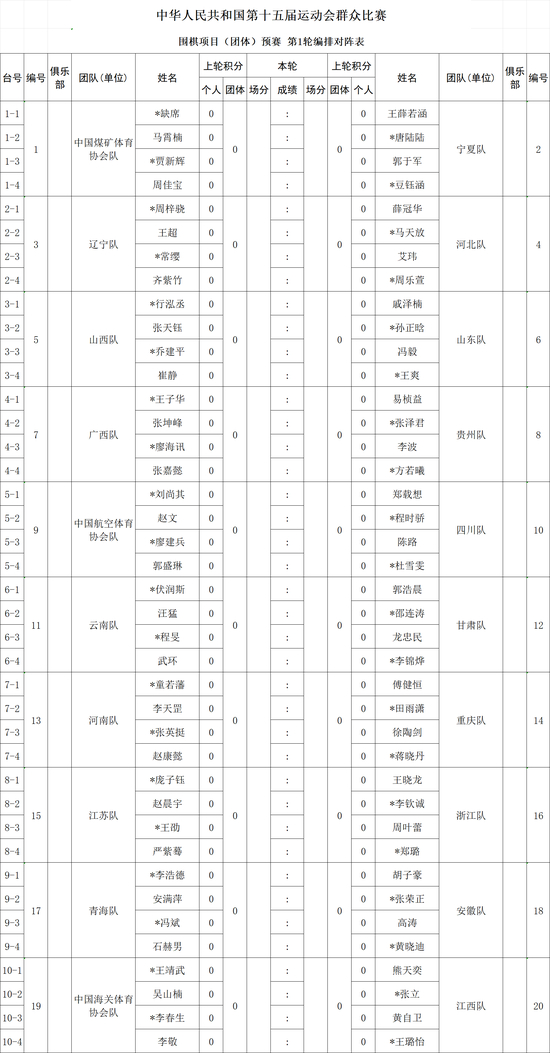 9月13日至15日,中華人民共和國第十五屆運(yùn)動(dòng)會(huì)群眾比賽圍棋項(xiàng)目(團(tuán)體)將在浙江衢州進(jìn)行預(yù)賽階段的體預(yù)比賽。來自全國33支隊(duì)伍共計(jì)131名運(yùn)動(dòng)員參加全民團(tuán)體組比賽,賽日首輪他們將通過為期三天的開賽比賽,決出團(tuán)體組別的趙晨全運(yùn)會(huì)決賽資格。
