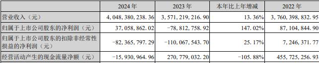 據(jù)公司2024年年報,報告期內(nèi),公司實現(xiàn)營業(yè)收入40.48億元,同比增長13.36%;歸屬于上市公司股東的凈利潤3705.89萬元,同比增長147.02%;歸屬于上市公司股東的扣非凈利潤為-8236.58萬元,2023年為-1.10億元;經(jīng)營活動產(chǎn)生的現(xiàn)金流量凈額為-1593.10萬元,同比減少105.88%。