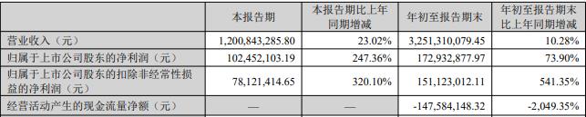 年初至報告期末,公司實現(xiàn)營業(yè)收入32.51億元,同比增長10.28%;歸屬于上市公司股東的凈利潤1.73億元,同比增長73.90%;扣除非經(jīng)常性損益后的凈利潤1.51億元,同比增長541.35%;經(jīng)營活動產(chǎn)生的現(xiàn)金流量凈額-1.48億元。