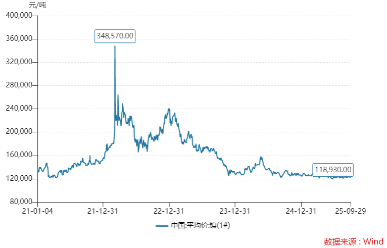 國內(nèi)鎳平均價格2023年起進入震蕩下行通道,近兩年處于相對低位。2025年9月末最新報價為12.23萬元/噸。