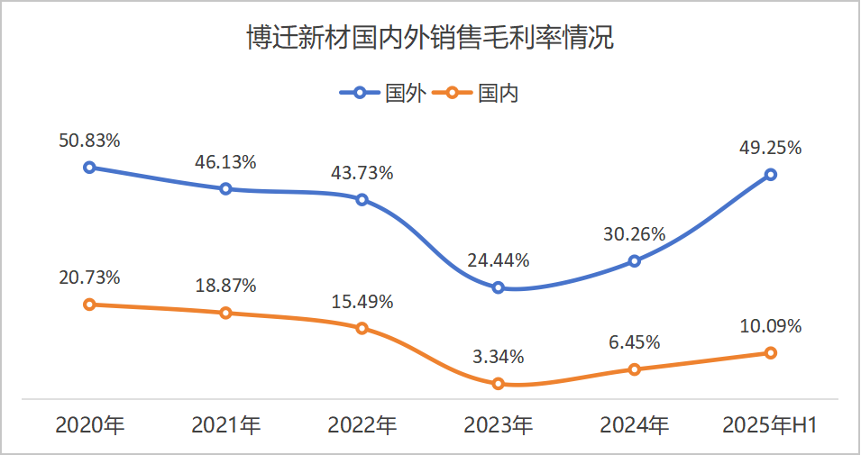 2024年和2025年上半年數(shù)據(jù)顯示,遷新博遷新材境外業(yè)務(wù)占比六成左右,材連此后,走漲境外業(yè)務(wù)占比預(yù)計進一步提升。需注