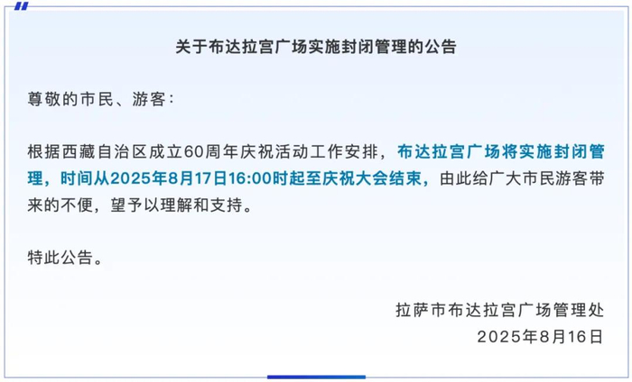 據(jù)西藏日報消息,今日8月17日)16時起,布達拉宮廣場將實施封閉管理,拉薩宇拓路段及部分道路將實行交通管制,請市民和游客合理安排出行、游玩時間。此外,拉薩市公安局交通管理支隊發(fā)布公告表示,將于8月17