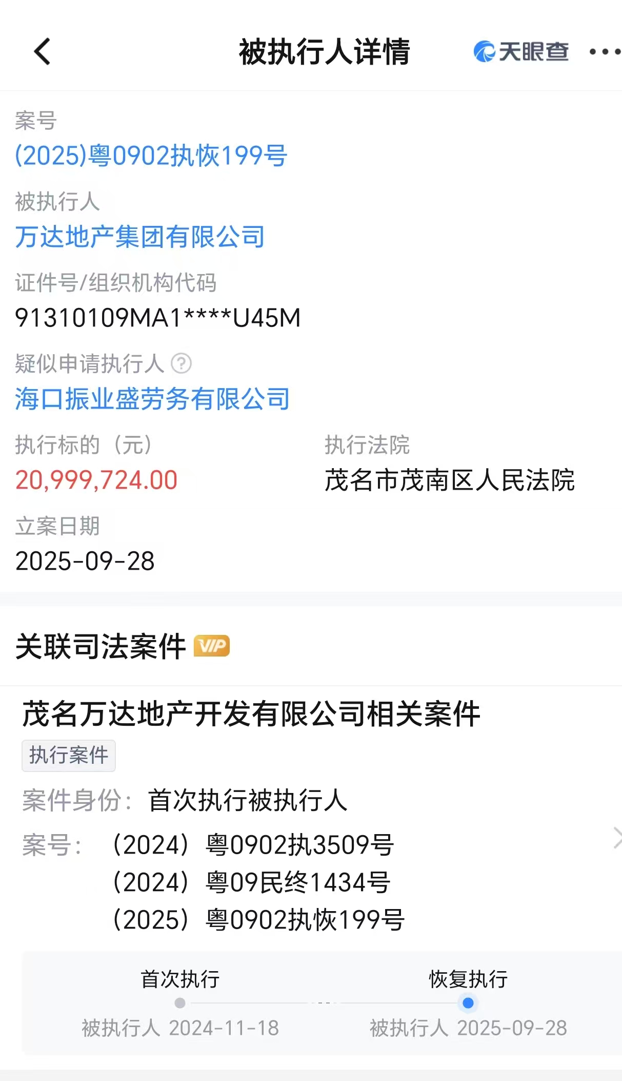 案件審理流程顯示,達(dá)萬(wàn)限因與??谡駱I(yè)盛勞務(wù)公司存在合同糾紛,地產(chǎn)等被2024年11月18日,恢復(fù)萬(wàn)達(dá)地產(chǎn)和茂名萬(wàn)達(dá)地產(chǎn)成為被執(zhí)行人,執(zhí)行制消執(zhí)行標(biāo)的費(fèi)令2303萬(wàn)元;今年5月16日,萬(wàn)達(dá)地產(chǎn)以及法定代表人劉詩(shī)文被限制高消費(fèi)。高達(dá)截至今年5月18日,達(dá)萬(wàn)限上述執(zhí)行標(biāo)的地產(chǎn)等被還有1103萬(wàn)元未履行。