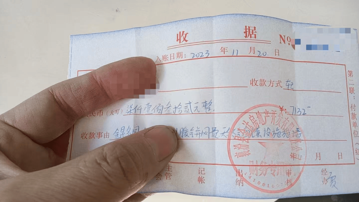 由于李先生認為這筆錢開發(fā)商沒有理由收取,便一直沒交,但也因此無法從開發(fā)商處拿到房屋鑰匙并接房?!伴_發(fā)商說不交就不給鑰匙,有業(yè)主因為著急入住,就交了這筆錢?!崩钕壬峁┑囊粡埳w有金達公司財務專用章的收據(jù)顯示,2023年11月20日,金達公司收取某業(yè)主“暖氣并網(wǎng)費”“天然氣配套設施施工費”共計7132元。