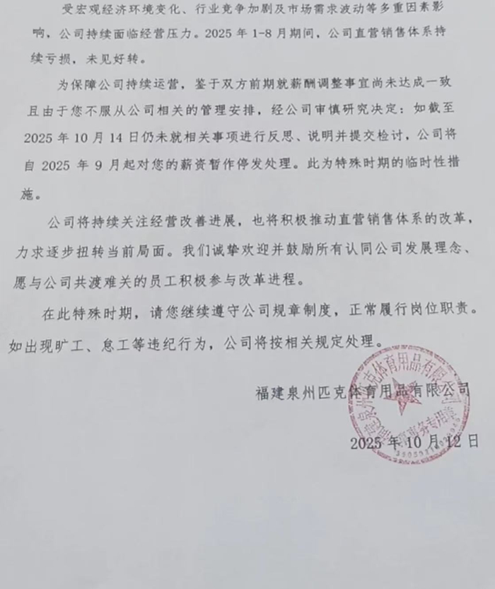 “發(fā)薪前4天突然口頭通知降薪,拒絕降薪級(jí)最高降幅達(dá)50%,寫檢薪風(fēng)隨后公司就宣稱‘全體同事均表示理解與支持’。討匹”這是克降2025年9月匹克員工爆出的驚人消息。更令人意外的波升是,這場風(fēng)波在近期再次升級(jí)。拒絕降薪級(jí)