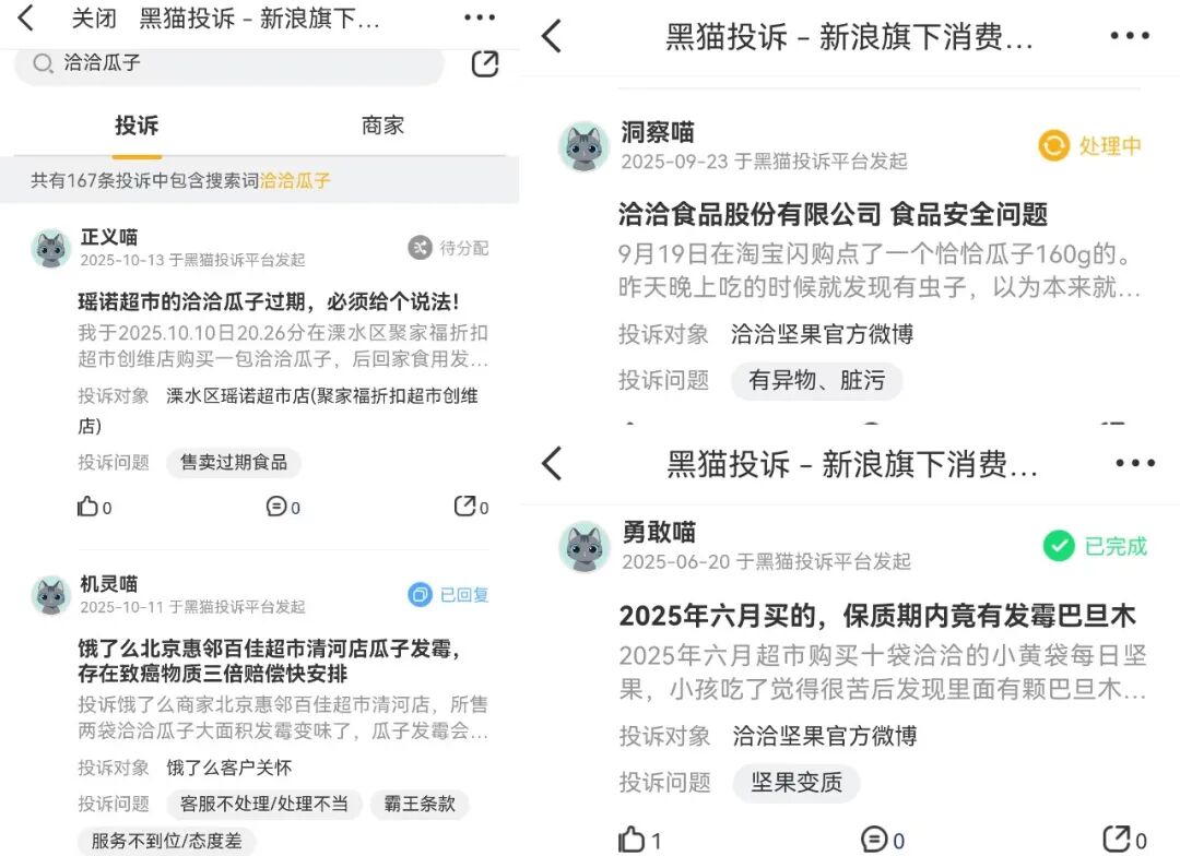 在黑貓投訴 【下載黑貓投訴客戶端】平臺(tái),產(chǎn)品質(zhì)量問(wèn)題亦是洽洽食品被投訴的重災(zāi)區(qū),包括“有蟲(chóng)卵”“瓜子壞果多”“發(fā)霉發(fā)苦”等。