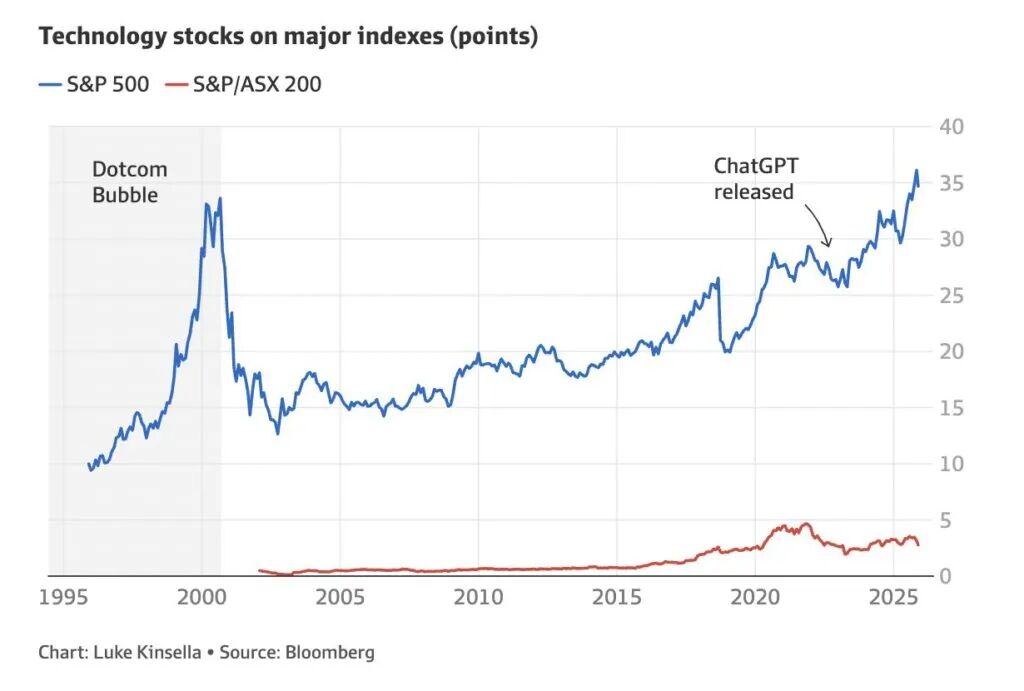 科技企業(yè)在澳大利亞標普 200 指數(shù)(ASX200)中的權(quán)重僅為 2.8%,與 2022 年 ChatGPT 發(fā)布時持平。