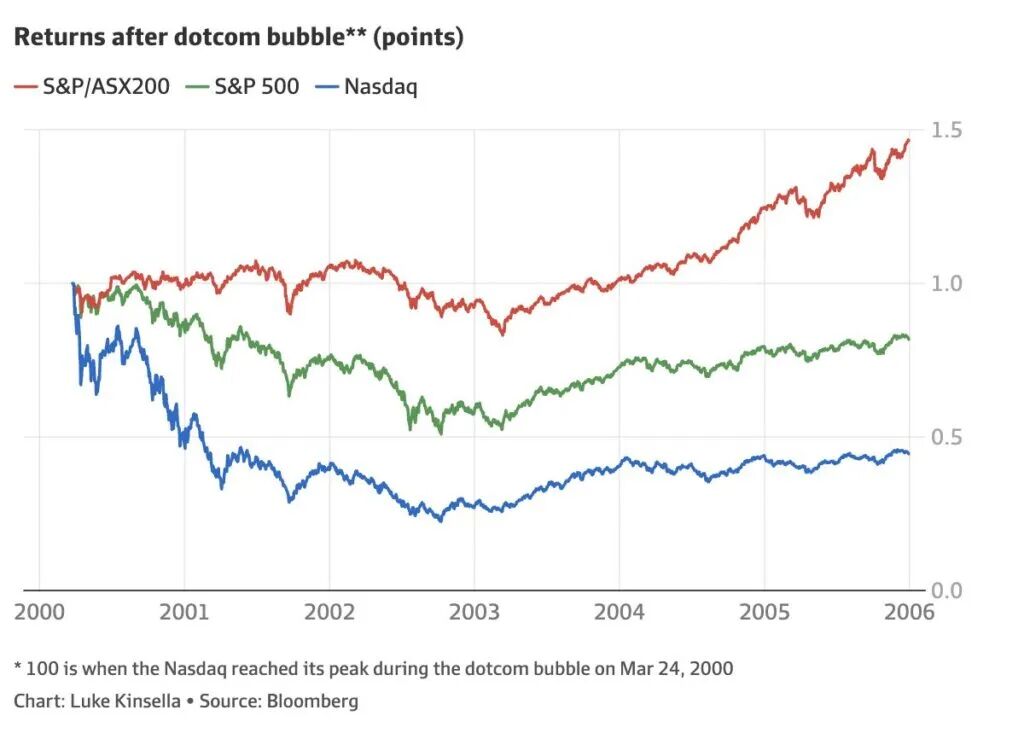 奧爾德表示,ASX200 甚至可能從海外市場回調(diào)中受益?;ヂ?lián)網(wǎng)泡沫破裂后,澳大利亞股市雖經(jīng)歷了數(shù)年橫盤,但表現(xiàn)優(yōu)于美國市場。
