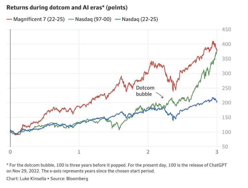 ChatGPT 發(fā)布后的三年間,納斯達克指數(shù)上漲 101%—— 這一漲幅已然可觀,但互聯(lián)網(wǎng)泡沫破裂前三年,該指數(shù)的漲幅高達 281%。