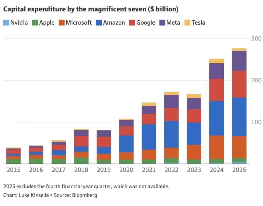 2024 至 2026 年間,亞馬遜、Meta、Alphabet、微軟和甲骨文將在資本基礎(chǔ)設(shè)施上支出超過 1 萬億美元,主要用于數(shù)據(jù)中心,其中約 60% 的成本用于采購芯片。