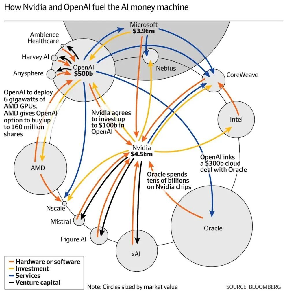 9 月,英偉達向 OpenAI 投資 1000 億美元,而 OpenAI 隨后將用這筆資金從英偉達回購芯片。另一個例子是,甲骨文(Oracle)宣布與 OpenAI 達成數(shù)千億美元的合作后,股價大幅上漲。
