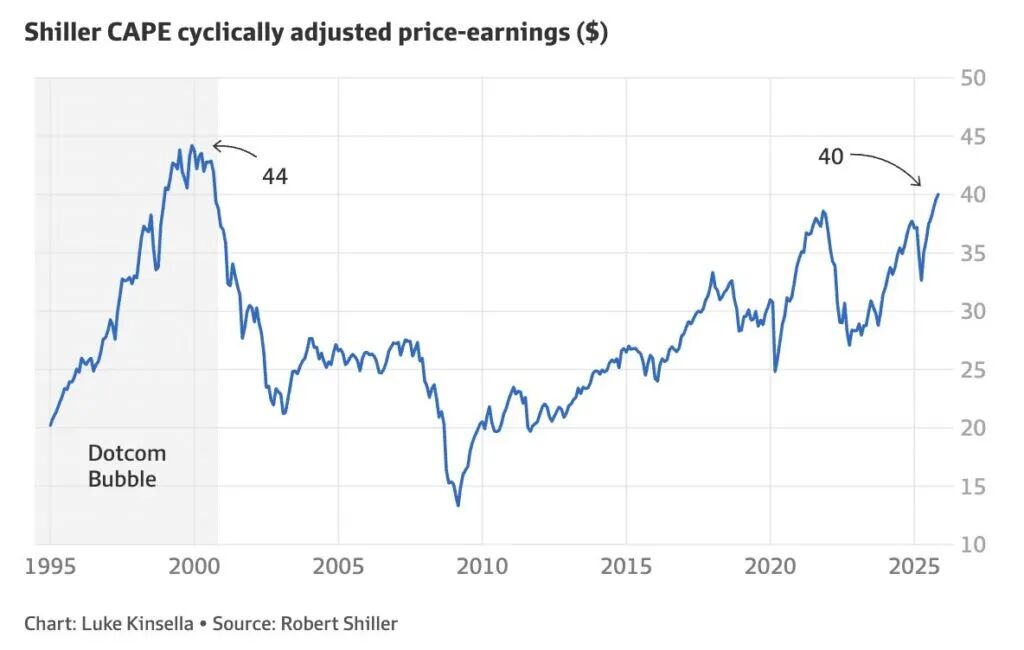 那么當(dāng)前現(xiàn)實如何?哈佛大學(xué)經(jīng)濟學(xué)家杰森?福爾曼表示,證明人工智能存在 “泡沫” 的最佳證據(jù)是席勒周期性調(diào)整市盈率(Shiller CAPE),該指標目前處于 150 年來的第二高位。