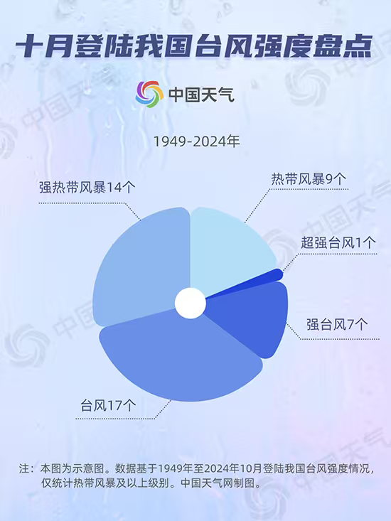 雖然十月登陸我國的臺(tái)風(fēng)數(shù)量不算多,但強(qiáng)度卻不可小覷。統(tǒng)計(jì)數(shù)據(jù)顯示,過去76年間,十月登陸我國的臺(tái)風(fēng)共有48個(gè),其中,臺(tái)風(fēng)有17個(gè)、強(qiáng)臺(tái)風(fēng)7個(gè)、超強(qiáng)臺(tái)風(fēng)有1個(gè),臺(tái)風(fēng)及以上級(jí)別占比超五成。