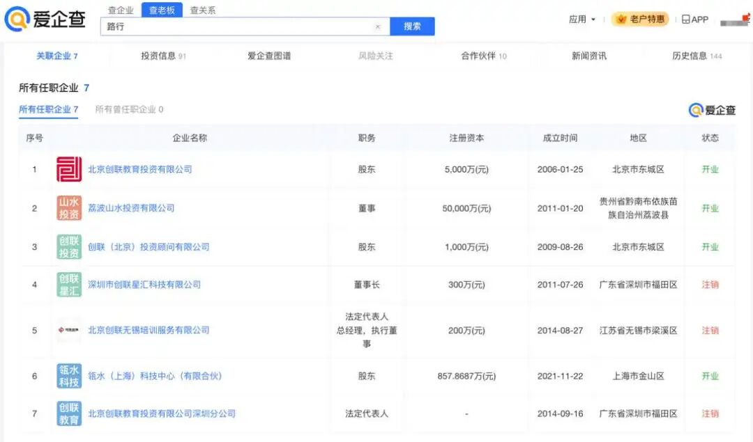 另據(jù)愛企查App,目前,路行名下關(guān)聯(lián)近10家企業(yè),涉及培訓(xùn)、投資、科技領(lǐng)域,其中超半數(shù)為開業(yè)狀態(tài),包括北京創(chuàng)聯(lián)教育投資有限公司、荔波山水投資有限公司、創(chuàng)聯(lián)(北京)投資顧問有限公司等。在上述為開業(yè)狀態(tài)的企業(yè)中,路行擔(dān)任股東、董事職務(wù)。