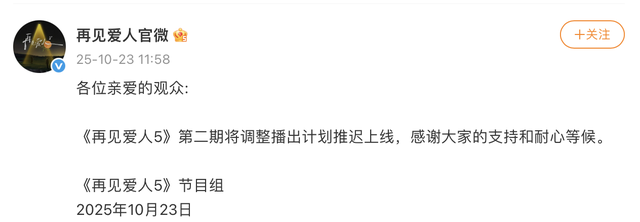 《再見愛人5》節(jié)目組10月23日發(fā)文稱,行賄第二期將調(diào)整播出計(jì)劃推遲上線。人延