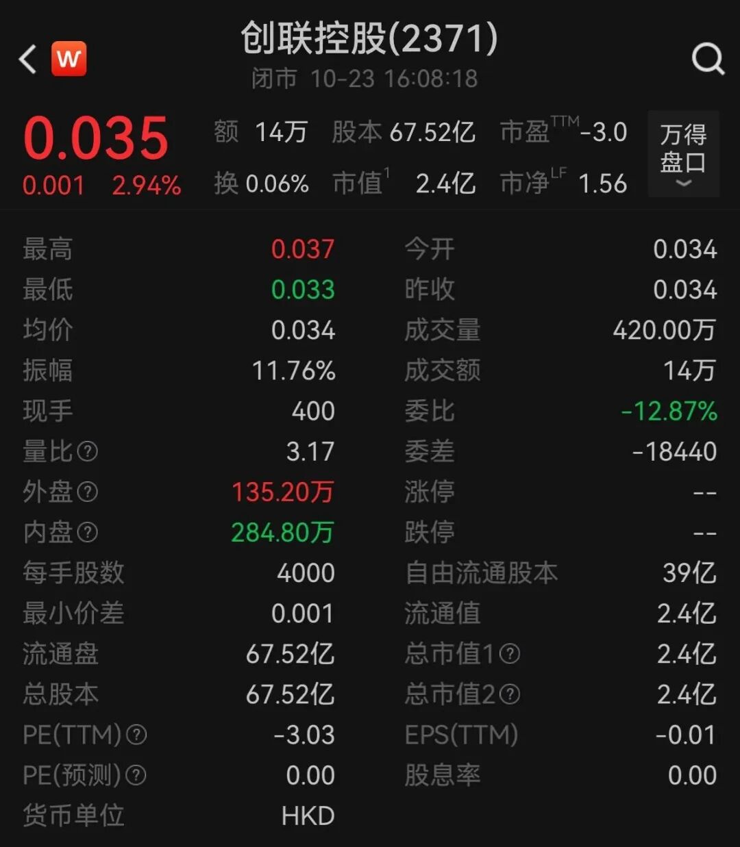 截至10月23日,創(chuàng)聯(lián)控股股價(jià)上漲2.94%,報(bào)0.035港元/股,市值約2.4億港元。