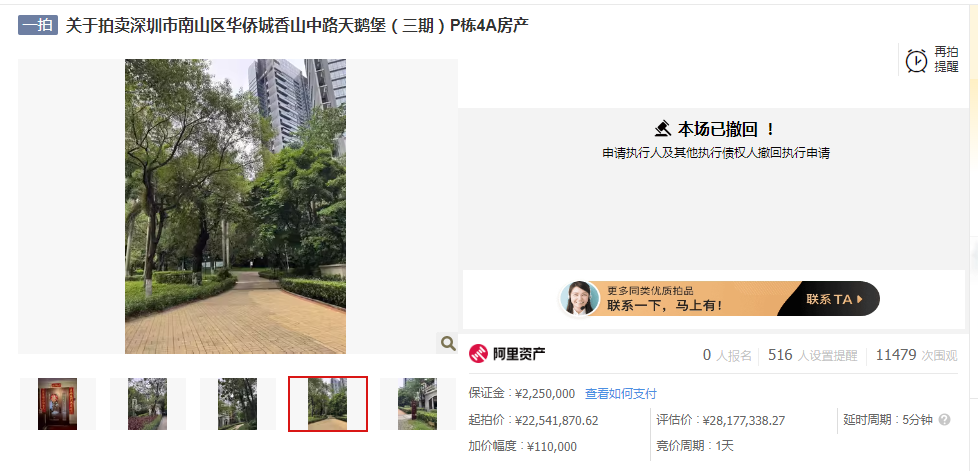 在10月這一批豪宅法拍中,華僑城天鵝堡三期的一套復(fù)式房源就在開拍前撤回了。