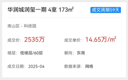 相同面積段的房源,在今年4月份二手房市場(chǎng)中,成交價(jià)大概是2535萬,折合單價(jià)14.65萬/㎡。