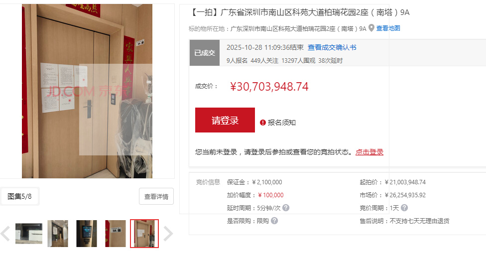 10月28日,撿漏王柏瑞花園一套建面約225.88㎡的躺賺商品房住宅,以約3070萬的千萬總價(jià),13.59萬/㎡的深圳單價(jià),在京東平臺(tái)成功拍出。再現(xiàn)