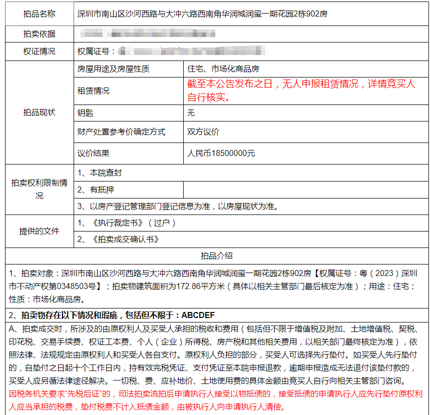 但根據(jù)公告顯示,該房產(chǎn)的租賃情況尚需核實(shí),且買家要先墊付增值稅、契稅等一系列的稅費(fèi),真真是驗(yàn)證了那句,富貴險(xiǎn)中求。