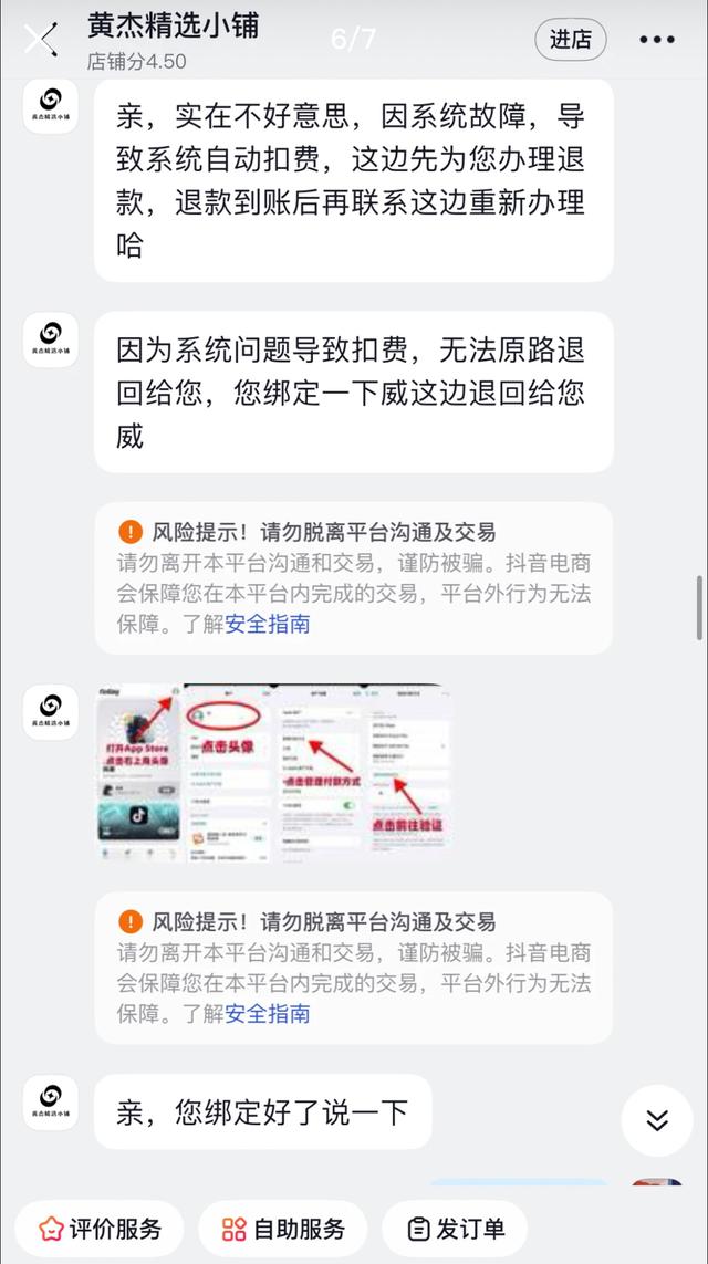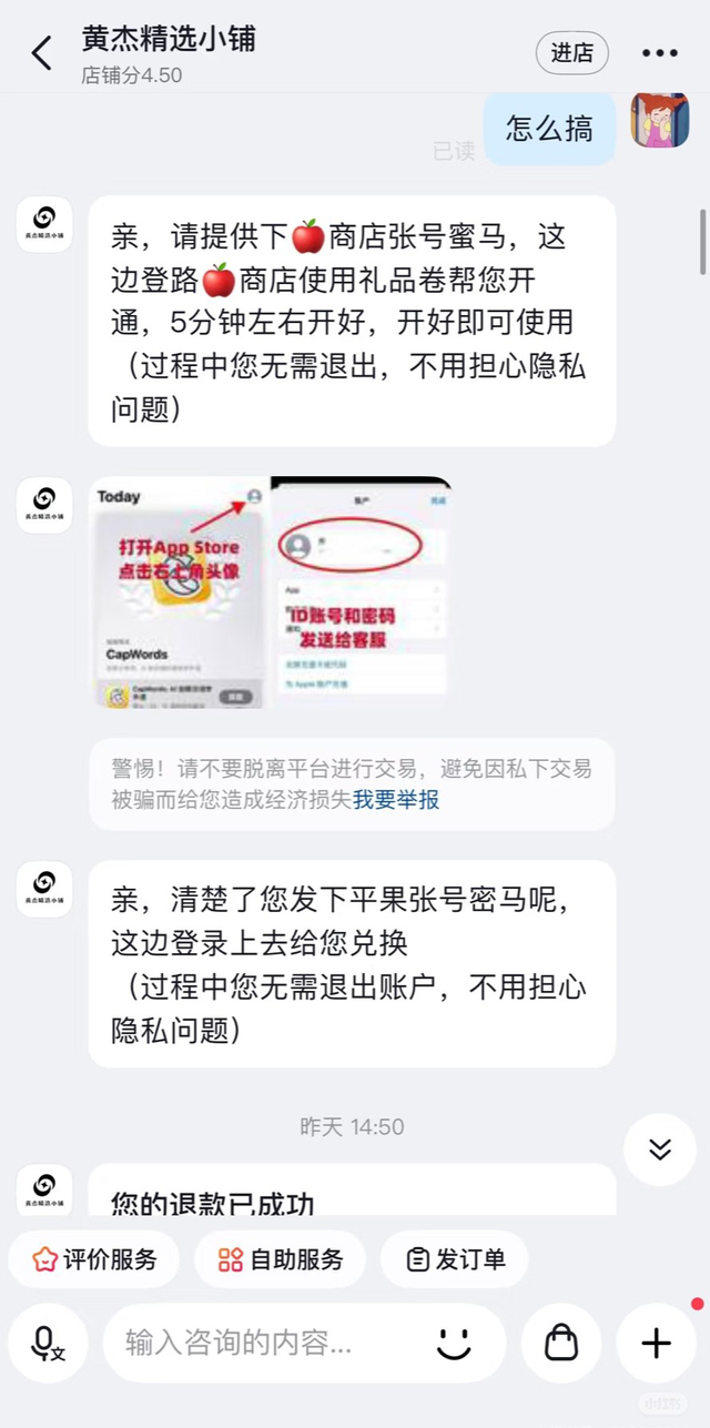來自廣西的譚女士也因同樣的招數(shù)陷入騙局,10月11日,她在抖音商城購買了山姆會員一日卡,下單后,名為“黃杰精選小鋪”店鋪的客服給她發(fā)送了一張充值流程圖。圖中顯示,需要她提供蘋果賬戶的賬號和密碼,客服表示“需要使用蘋果商店禮品券開通”,并反復(fù)強調(diào)“過程中您無需退出賬戶,無需擔(dān)心隱私問題”。