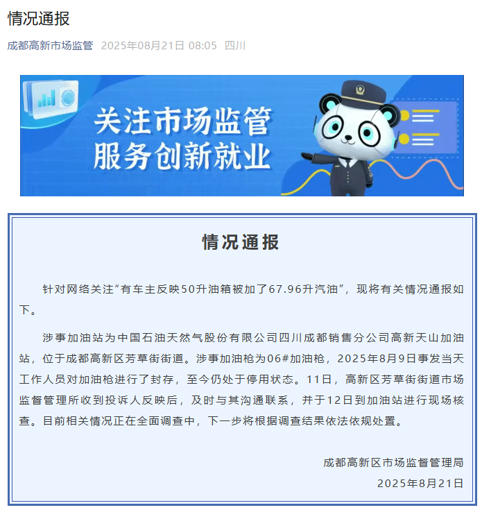 新京報(bào)訊8月21日,成都高新區(qū)市場監(jiān)督管理局發(fā)布情況通報(bào),針對網(wǎng)絡(luò)關(guān)注“有車主反映50升油箱被加了67.96升汽油”,現(xiàn)將有關(guān)情況通報(bào)如下。涉事加油站為中國石油天然氣股份有限公司四川成都銷售分公司高新2025-11-30