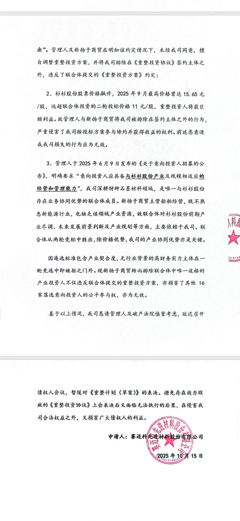 直至2025年10月1日,賽邁科通過杉杉股份發(fā)布的公告,才知曉《重整投資協(xié)議》已于2025年9月29日簽署完畢,簽署主體包含非聯(lián)合體成員,即廈門TCL科技產(chǎn)業(yè)投資合伙企業(yè)(有限合伙)。后又于10月21日召開債權(quán)人會(huì)議表決。