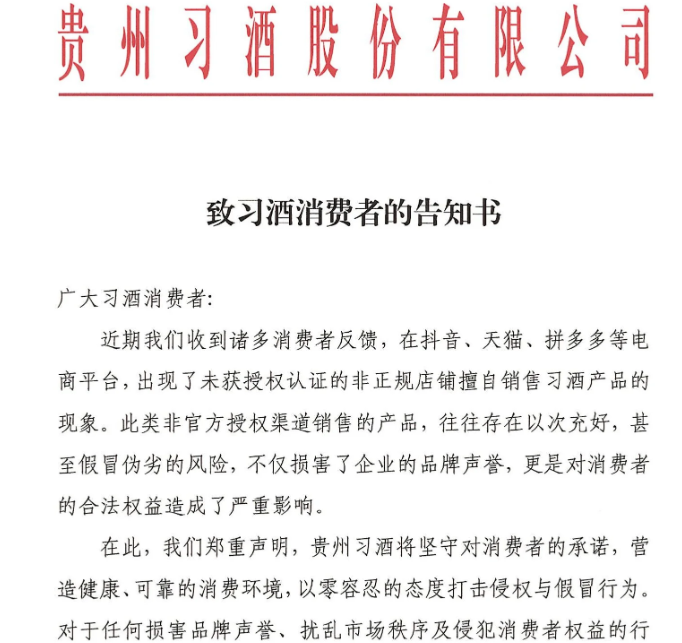 除了五糧液,貴州習(xí)酒也于近日發(fā)布聲明,指責(zé)線上非授權(quán)渠道銷售產(chǎn)品存在假冒偽劣風(fēng)險,并公布了線上授權(quán)名單。貴州茅臺也公布了官方及第三方合作線上渠道的名單,并提醒消費(fèi)者認(rèn)準(zhǔn)并選擇官方、正規(guī)渠道購買產(chǎn)品。
