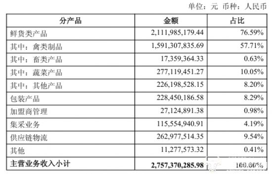 而鮮貨類產(chǎn)品終的核心品類禽類制品收入為15.91億元,同比減少20.79%,蔬菜產(chǎn)品收入為2.77億元,同比減少11.56%,畜類產(chǎn)品和其他產(chǎn)品分別收入1735.94萬元、2.26億元。