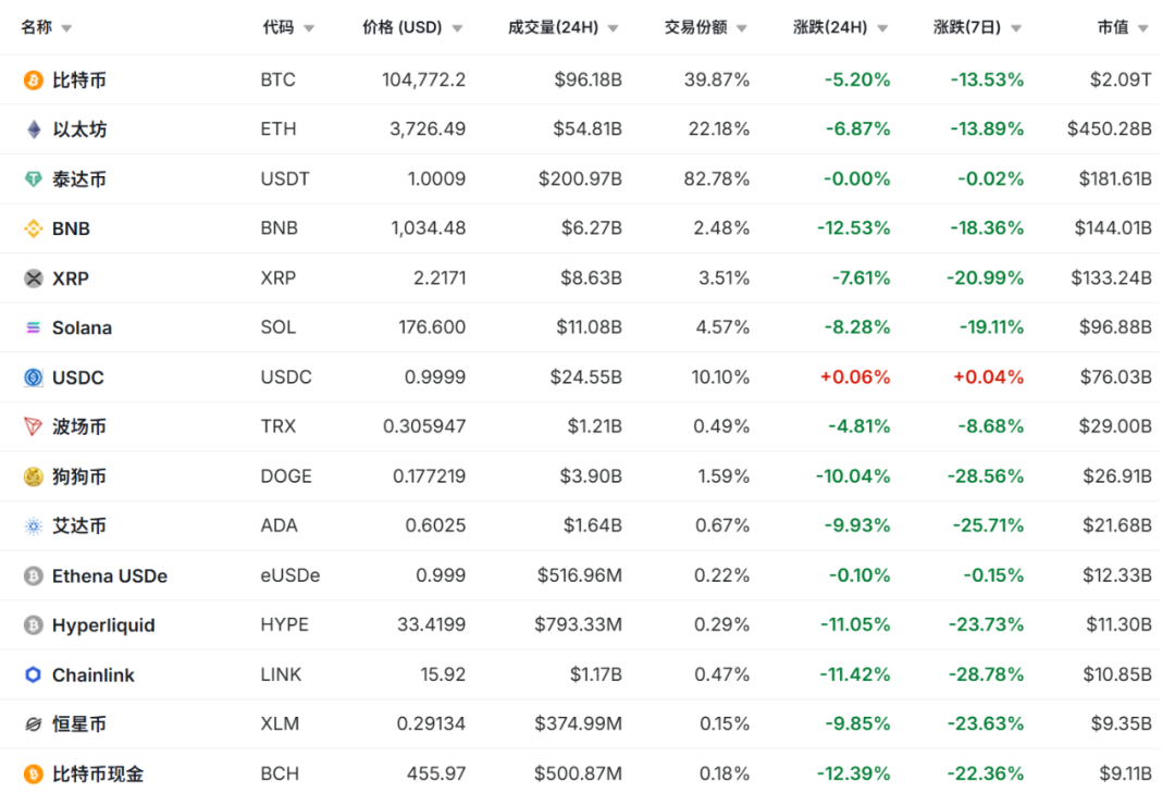 剛剛過去的24小時內(nèi),加密貨幣集體跳水,比特幣一度從11.15萬美元跌至10.45萬美元,盤中跌幅一度超過5.2%。以太坊跳水超6%,BNB、Solana等紛紛跟跌。