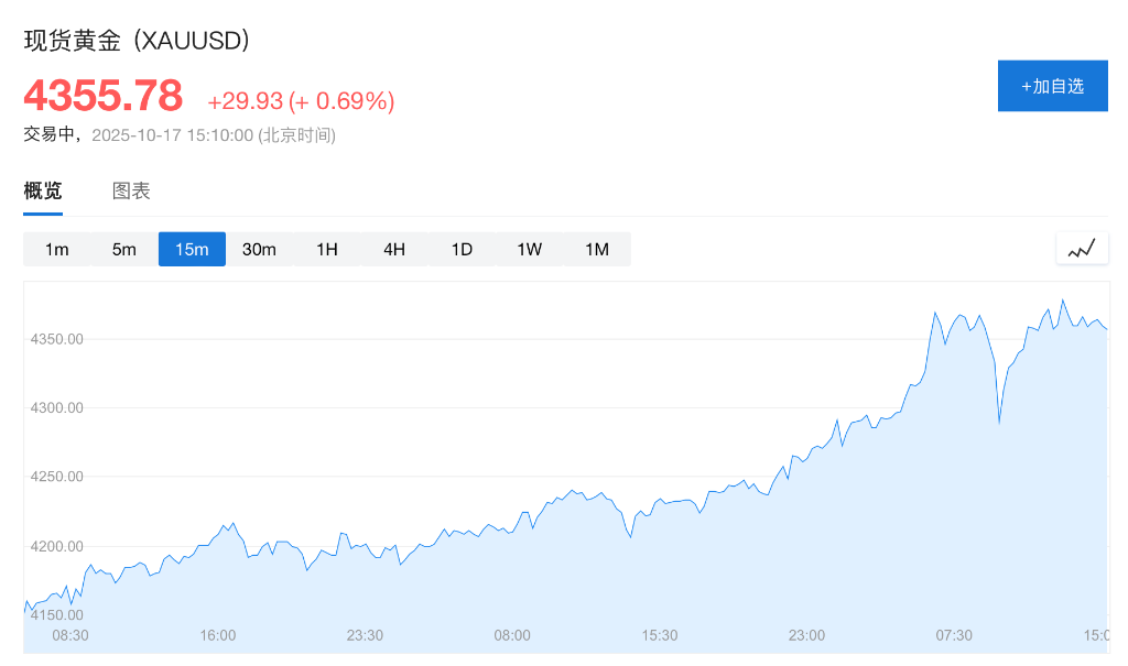 現(xiàn)貨黃金漲近0.7%,現(xiàn)報4355美元/盎司。避險情緒提振黃金價格不斷刷新歷史紀錄。