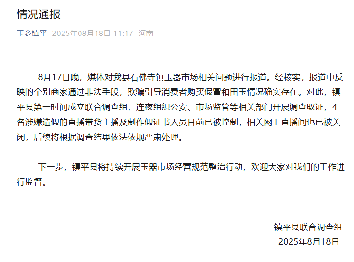 河南鎮(zhèn)平通報商家引導消費者買假和田玉:4名涉事主播和制假人員被控制 — 新京報